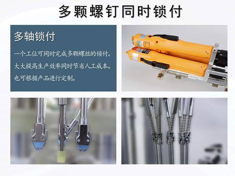 多軸立式自動擰螺絲機主要由自動送釘機、多軸鎖付系統、PLC控制系統等組成,內置集成作業臺,體積小、不占地。通過治具固定好產品放置的位置,由設備自動完成螺絲輸送及緊固工作,根據產品特點設計鎖付方案,實現一次擰好所有螺絲,設備性能穩定,效率高,可替代大量人工重復勞動,減少企業成本。