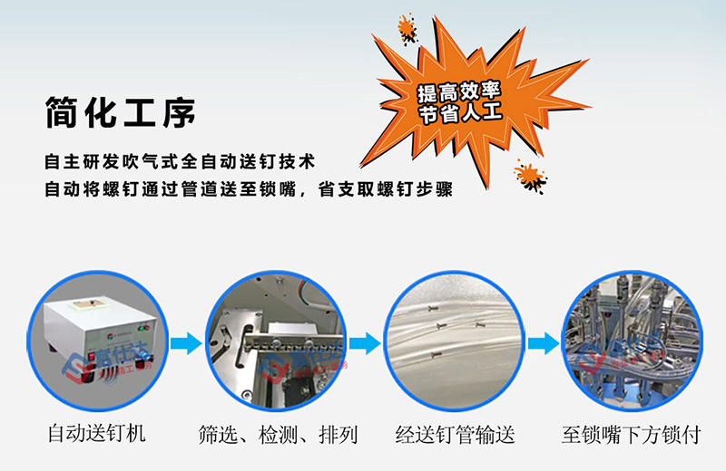 該鎖付系統可等同為全自動鎖螺絲流水線,通過四個工作站的作業,將百葉窗扇葉通過螺絲緊固在框架內的指定位置,螺絲采用自主研發吹氣式自動送釘機,直接輸送至鎖付機構;扇葉通過專用治具與框架定位,需手動放置;鎖付系統采用水平雙方向同時作業,配置4把電批位于兩側,一次擰好4顆螺絲;移動式作業臺根據程序設定,逐點向前推進并自動擰螺絲。